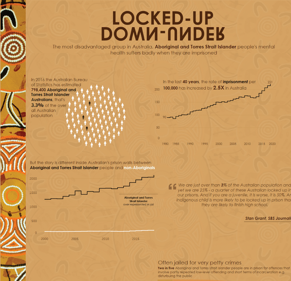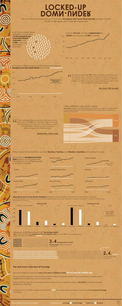 When I first saw FF’s #IronQuest entry, I instantly reached out to him on Twitter saying ‘well done’ and told him that I was investigating a similar topic for my iron quest entry – Aboriginal and Torres Strait Island people’ healthcare in prison – but I was struggling to put a narrative to my viz! FF was kind enough to offer to collaborate, I didn’t hesitate at the time and said ‘yes’ straight away.