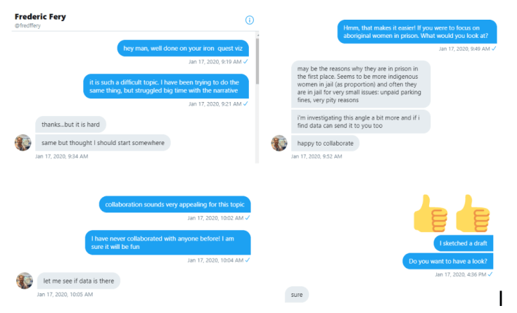 FF: As Tableau data visualisation is only a hobby for me, I do my work alone. I often get my wife and kids to do a sanity check (incl spelling) but I thought that was an awesome opportunity to develop something from scratch with someone remotely. I also Viz a lot about Aboriginal and Torres Strait Island people issues, and I appreciated a fellow data vizer interest.