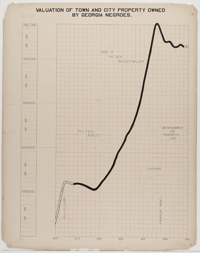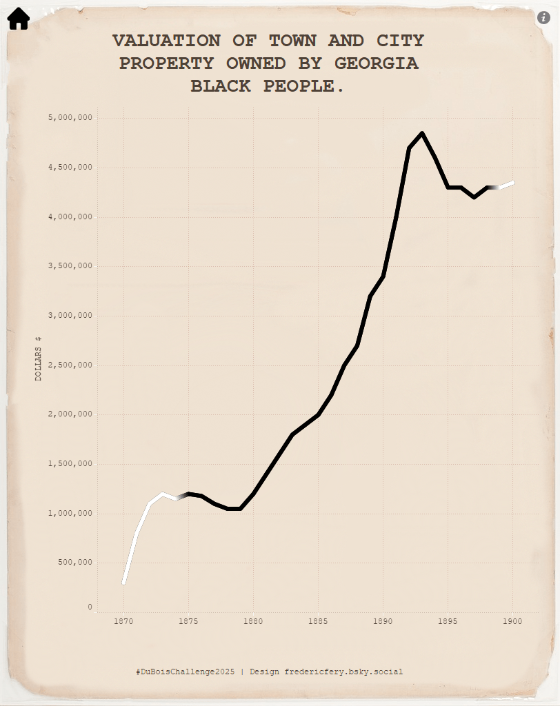 The line chart showing the dramatic growth (and subsequent slight decline) in urban property values demonstrated Du Bois’s skill in showing economic trends. I preserved the stark visual contrast while ensuring modern readability.