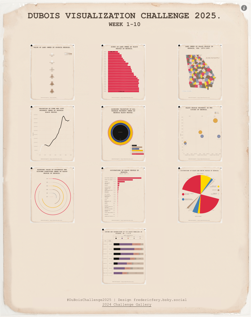 After ten weeks of recreating and reimagining W.E.B. Du Bois’s groundbreaking data visualizations, I’ve completed the 2025 Du Bois Visualization Challenge. This year marked a bit of a shift in my approach compared to the 2024 challenge, as I embraced creative freedom rather than pursuing exact replications. Here’s a look back at this rewarding journey through data visualization history.