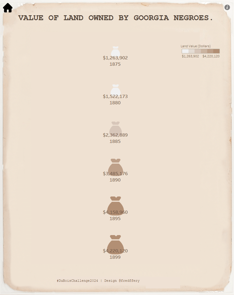 Starting with the money bag visualization showing the dramatic increase in land value over time presented a perfect introduction to Du Bois’s approach to making data relatable. I focused on maintaining the visual metaphor while updating the presentation for modern audiences.