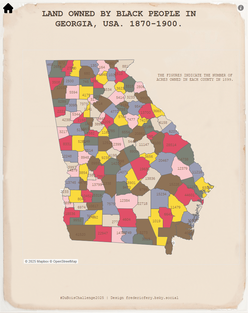 This county-level map visualization challenged me to work with geospatial data in Tableau while maintaining Du Bois’s careful color-coding system that highlighted regional patterns across Georgia.