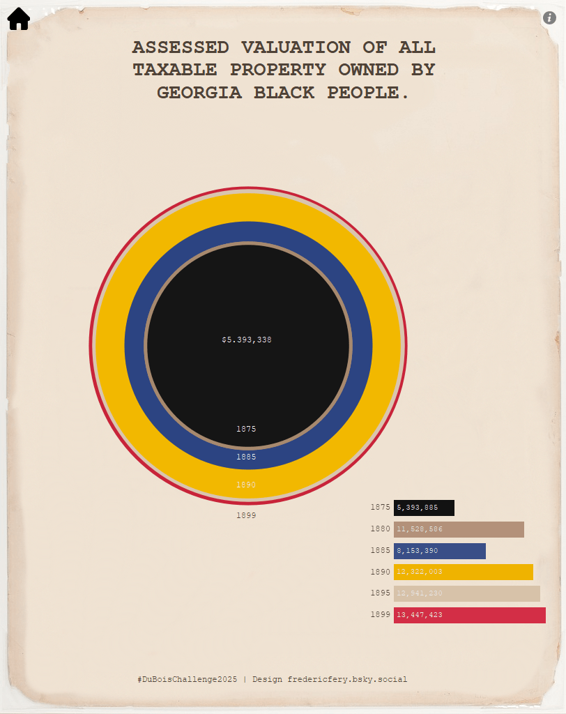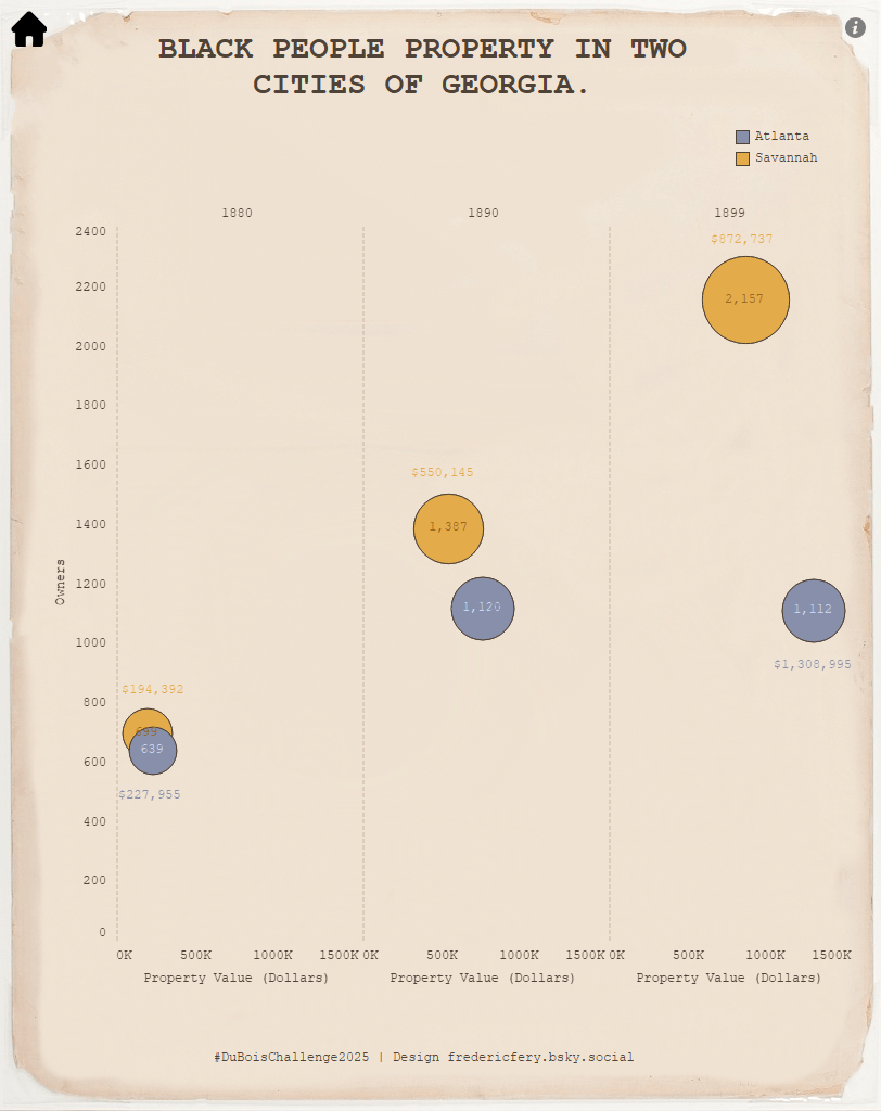 This shift proved particularly liberating for complex charts like Week 6’s “Negro Property in Two Cities of Georgia,” where I created an entirely different visualization that communicated the same data relationships but with modern techniques. Tableau’s out-of-the-box capabilities sometimes limited exact replication, but this constraint pushed me to think more creatively about how to honor Du Bois’s innovative spirit.