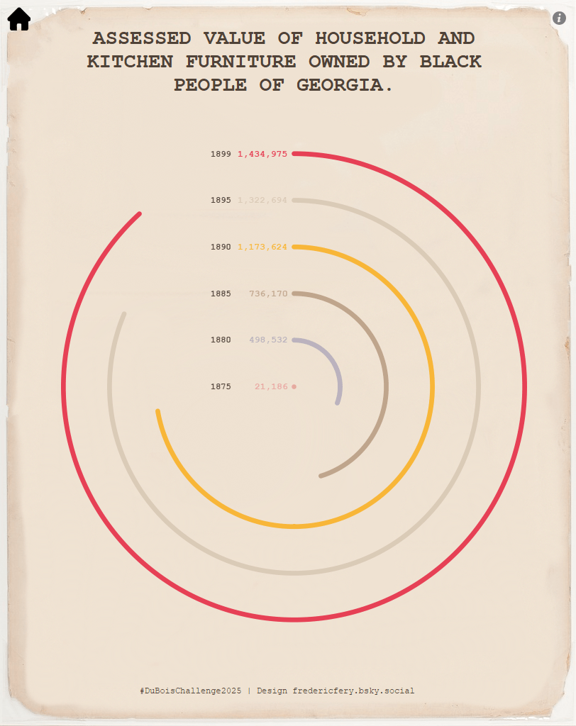 The spiral design showing growth in personal property ownership demonstrated Du Bois’s creative approach to showing progression. I maintained the spiral concept while enhancing readability of the specific values. This chart was also pretty hard to replicate using Tableau’s out of the box features.