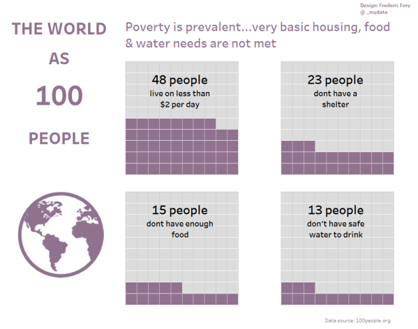 This week for Makeover monday week 48 we were asked to visualise data from 100people.org: The world as 100 people To keep with my Tableau tradition, I decided to learn a new trick. This week I wanted to learn how to make Waffle Charts. I found a great tutorial from Andy's Tableau tip Tuesday ... Continue Reading →